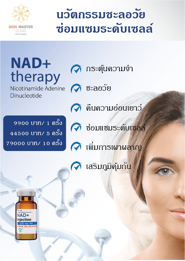NAD+ ย่อมาจาก Nicotinamide adenine dinuoleotide เป็นอนุพันธ์ของวิตามินบี 3 NAD+ มีความสำคัญ ในขบวนการฟื้นฟูเซลล์ในระดับ ดีเอ็นเอ ช่วยชะลอความเสื่อม และโรคที่เกิดจากความเสื่อมของร่างกาย